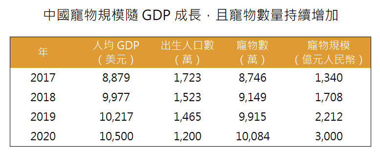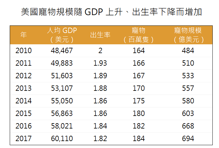根據過往美國寵物經濟發展經驗,隨著整體國民經濟的成長,用於寵物的支出將連帶提升。再加上寵物可以滿足人類的陪伴需求,且花費遠低於養育小孩的費用,某種程度上成為不想生小孩家庭的情感替代品,因此出生率降低也將提升飼養寵物的意願。
