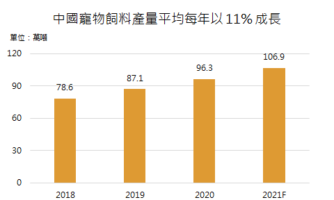 寵物食品將是最直接受惠的剛需市場,約佔整體寵物產值 50~60%。隨著寵物的家庭地位提升,飼主更加注重寵物的健康,從剩菜剩飯的餵食轉變成專用飼料,根據統計目前中國約 85% 以上的飼主會餵食寵物專用飼料,較 2018 年的 22% 有大幅成長。