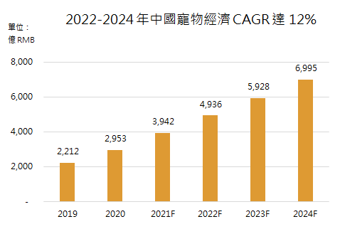 而近幾年中國經濟快速成長,加上早期一胎化造成的男女比失衡,以及雙薪家庭增多、社會女權意識上升等原因,出生率連年下降已是中國目前的一大問題。但也因此造成寵物經濟快速發展,2021 年中國城鎮寵物滲透率(不計算偏遠地區)為 39%,較 2019 年 17% 大幅提升,並持續成長。根據市場調查,中國寵物市場規模將在 2024 年達近 7,000 億人民幣,3 年 CAGR 達 12%。