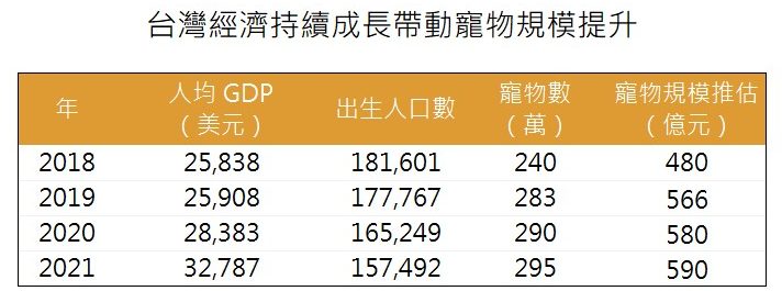 除了中國,台灣也出現經濟成長且生育率歷年降低的狀況,平日生活的孤單導致飼養寵物數提升,寵物經濟蓬勃發展,以市調平均每年飼養一隻犬貓花費約 2 萬元估算,2021 年台灣寵物市值高達 590 億元,未來可望因 GDP 成長和飼養寵物者增加而持續提高產值。