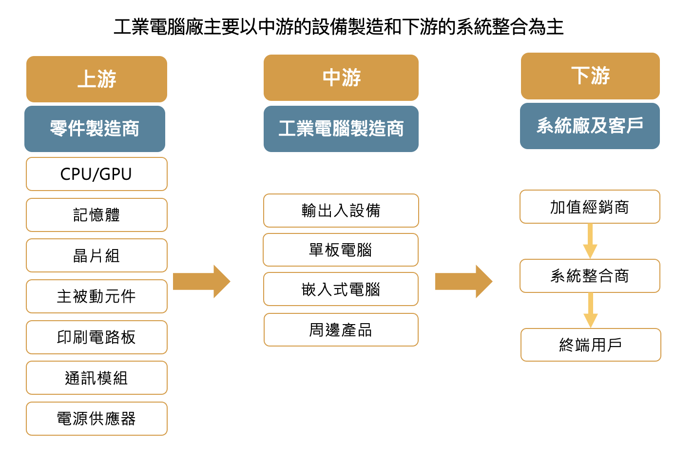 工業電腦產業屬於持續性的剛性需求,整體市場高度集中穩定,台廠主要負責中游代工及下游運籌管理。