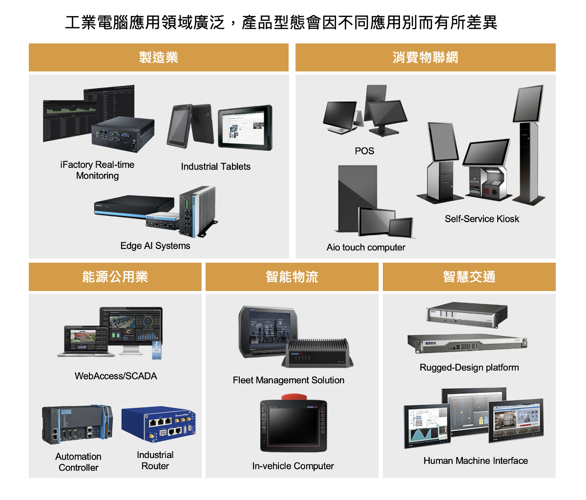 台灣工業電腦廠商包括研華(市:2395) 、樺漢(市:6414) 、振樺電(市:8114) 、安勤(櫃:3479) 、飛捷(市:6206) 、威強電(市:3022) 、艾訊(櫃:3088) 等,除研華、樺漢外,大多都是專注於特定領域,如主攻零售、醫療的振樺電、安勤、飛捷;交通運輸的艾訊;邊緣運算、網通的威強電。