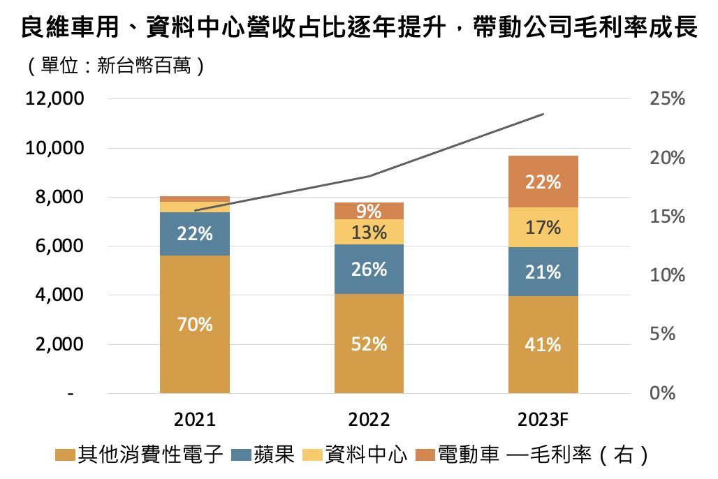 - 良維近年積極轉供資料中心與車用等高附加價值產品,預期 2023 年營收佔比將達 39%