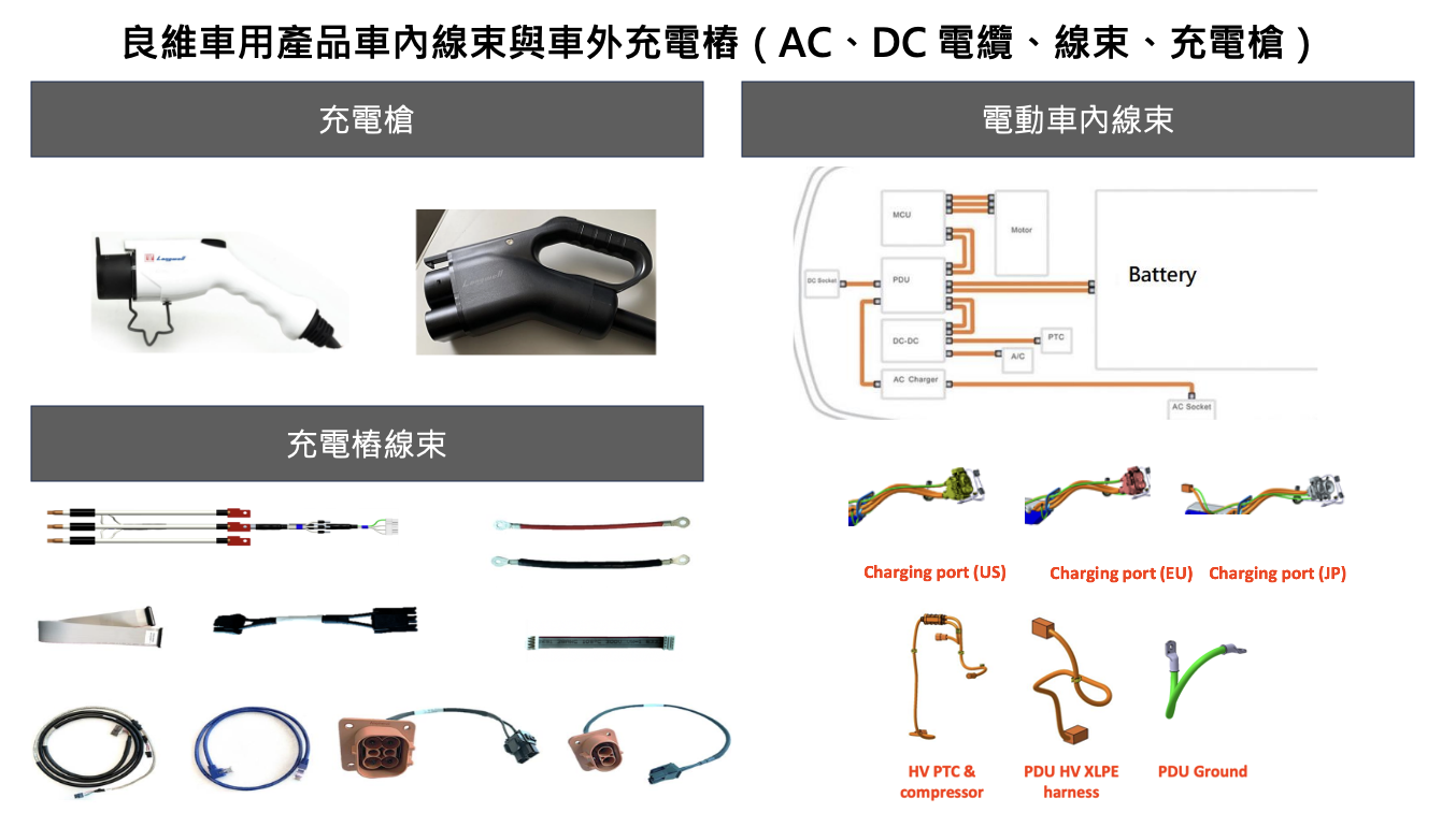 良維車用產品包含車內線束與車外充電樁(AC、DC 電纜、充電槍、電源線與線束)。車用產品要求高安全性,皆須安規認證(電動車內產品相較車外充電樁認證期更長),進入門檻高。
