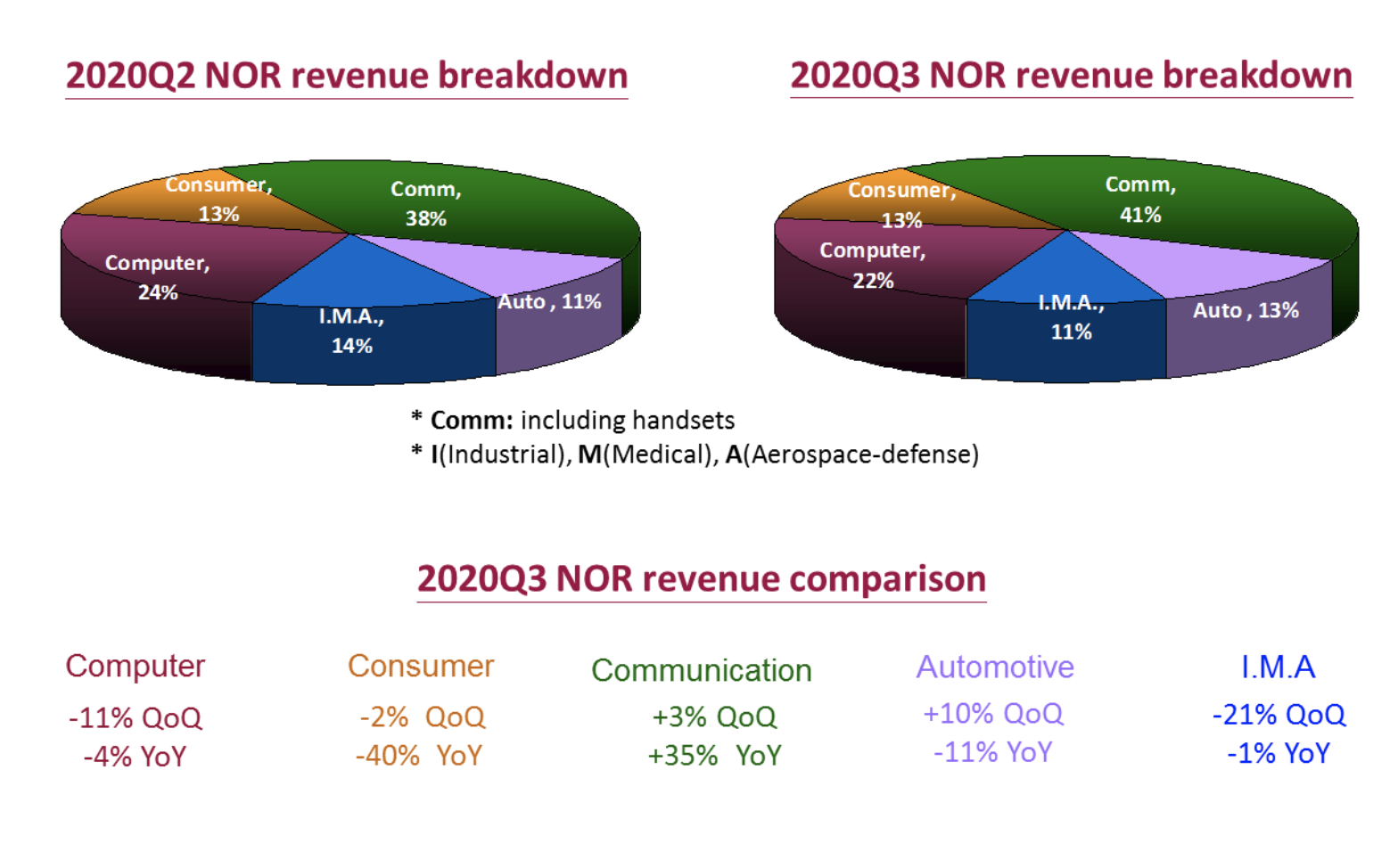 - 2020Q3 NOR Flash 市場價格雖然未調漲,但需求持續上升,預期 2020Q4 NOR Flash 將審慎樂觀。展望 2021 年,需求面隨著更多電子設備如 IoT 、車用、基地台、遊戲機等都需採用 NOR Flash 而增加,供給面則因美國對中芯禁令,使其可能無法出貨給下游 NOR Flash 製造商兆易創新而減少,預期若中美關係持續緊張,整體 NOR Flash 市場將呈現短期供不應求狀況。
