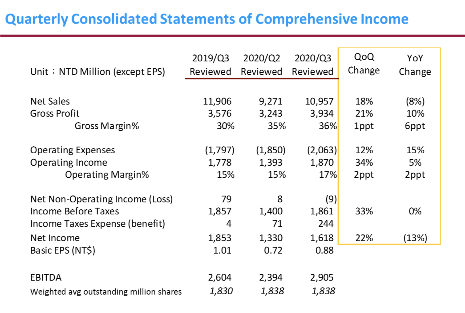 - 2020Q3 毛利率為 36%,YoY+6 ppts(百分點,percent points 的縮寫),QoQ+ 1 ppts,主要受惠於高產能利用率。另外 Q3 雖認列了存貨跌價迴轉利益,約增加毛利率 5%,但和因台幣升值造成的匯率損失 5% 剛好抵銷。