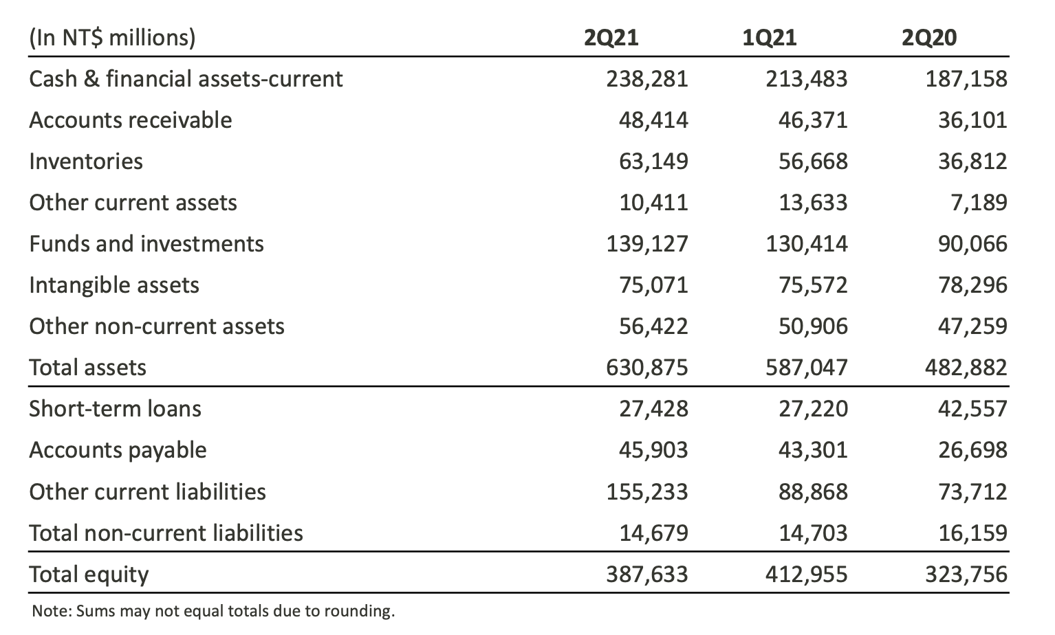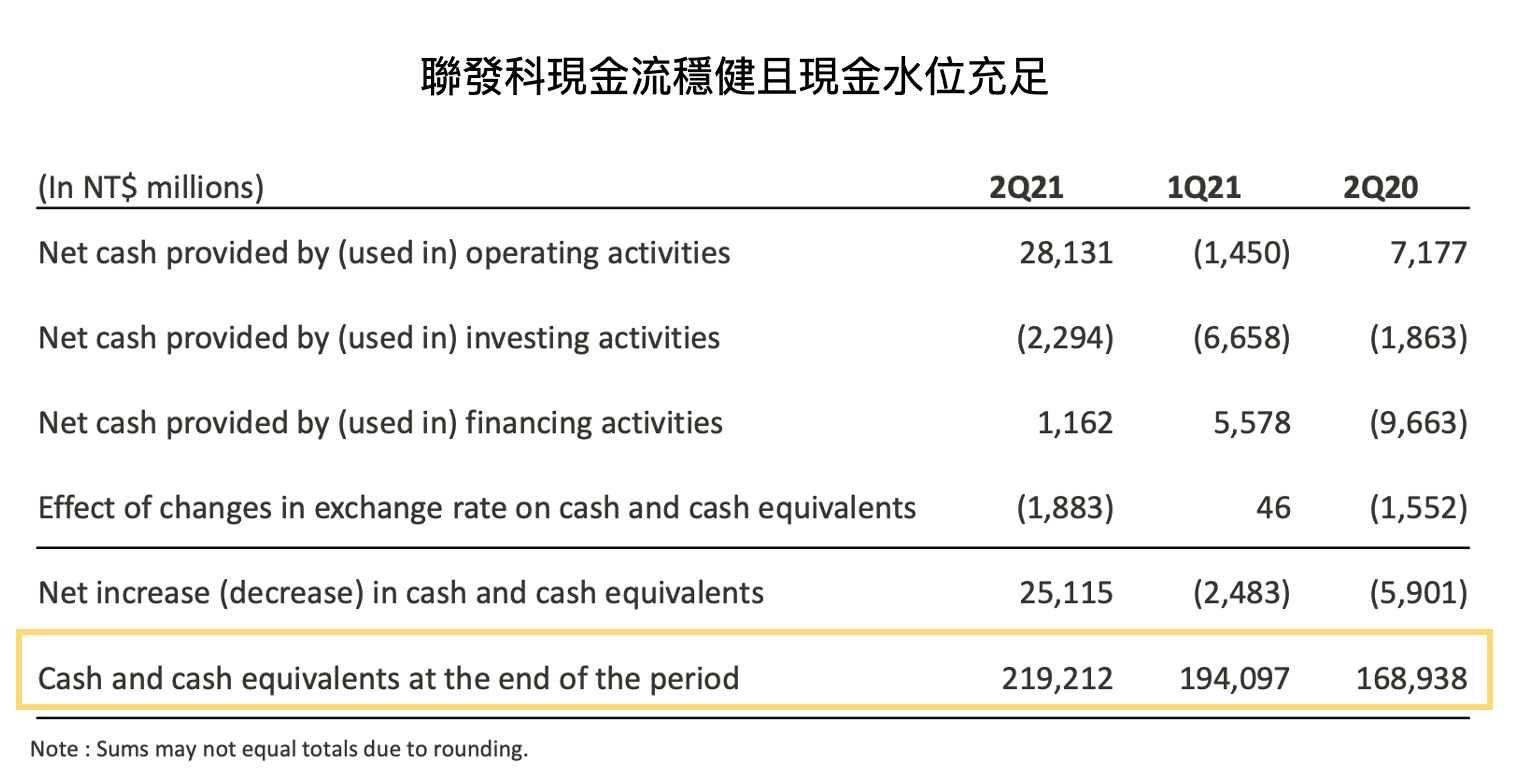 3. 聯發科 2021Q2 帳上現金為 2,192.1 億元(若包含現金等價物則為 2,382.8 億元),佔總資產 37.8%,整體現金水位充足。