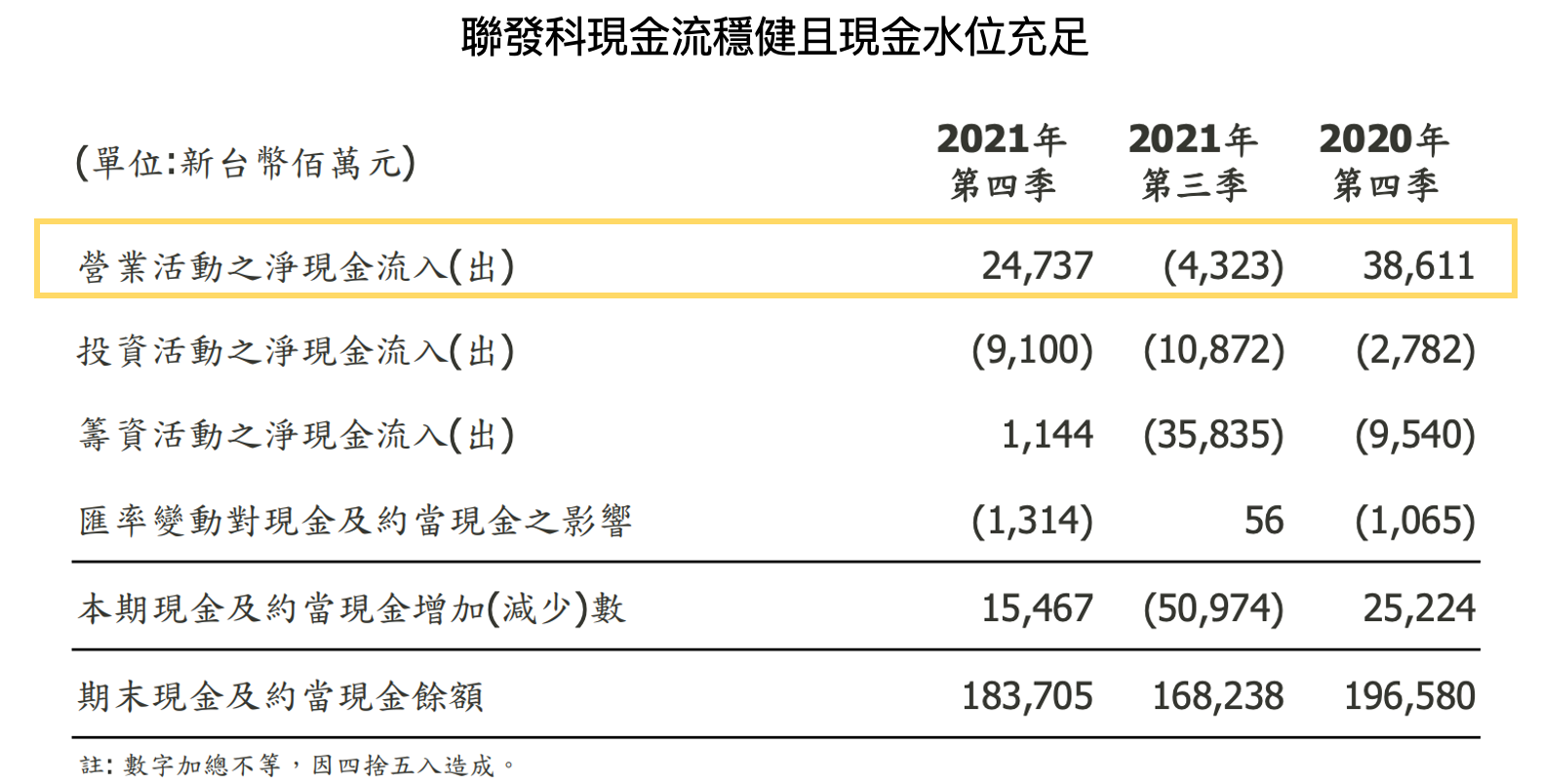 4. 聯發科 2021Q4 帳上現金為 1,837.1 億元(若包含現金等價物、金融資產則為 2,047.6 億元),佔總資產 31.0%,整體現金水位充足。