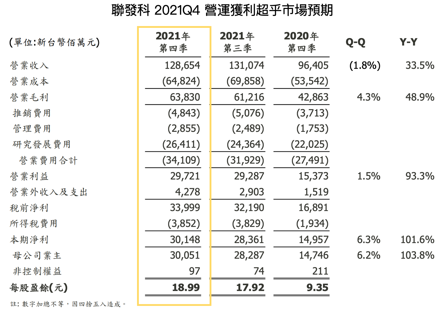 1. 聯發科 2021Q4 營收為 1,286.5 億元新台幣(以下同),YoY+33.5%、QoQ-1.8%;毛利率為 49.6%,YoY+5.1 ppts,QoQ+2.9 ppts,優於公司財測,成長主因 5G SoC、Wi-Fi 6 等高毛利產品佔比增加,且透過漲價有效轉嫁成本給客戶;營業利益率為 23.1%,YoY+7.2 ppts、QoQ+0.8 ppts,稅後淨利為 300.5 億元,YoY+103.8%、QoQ+6.2%;EPS 為 18.99 元, YoY+9.64 元、QoQ+1.07 元,整體表現符合公司財測高標。