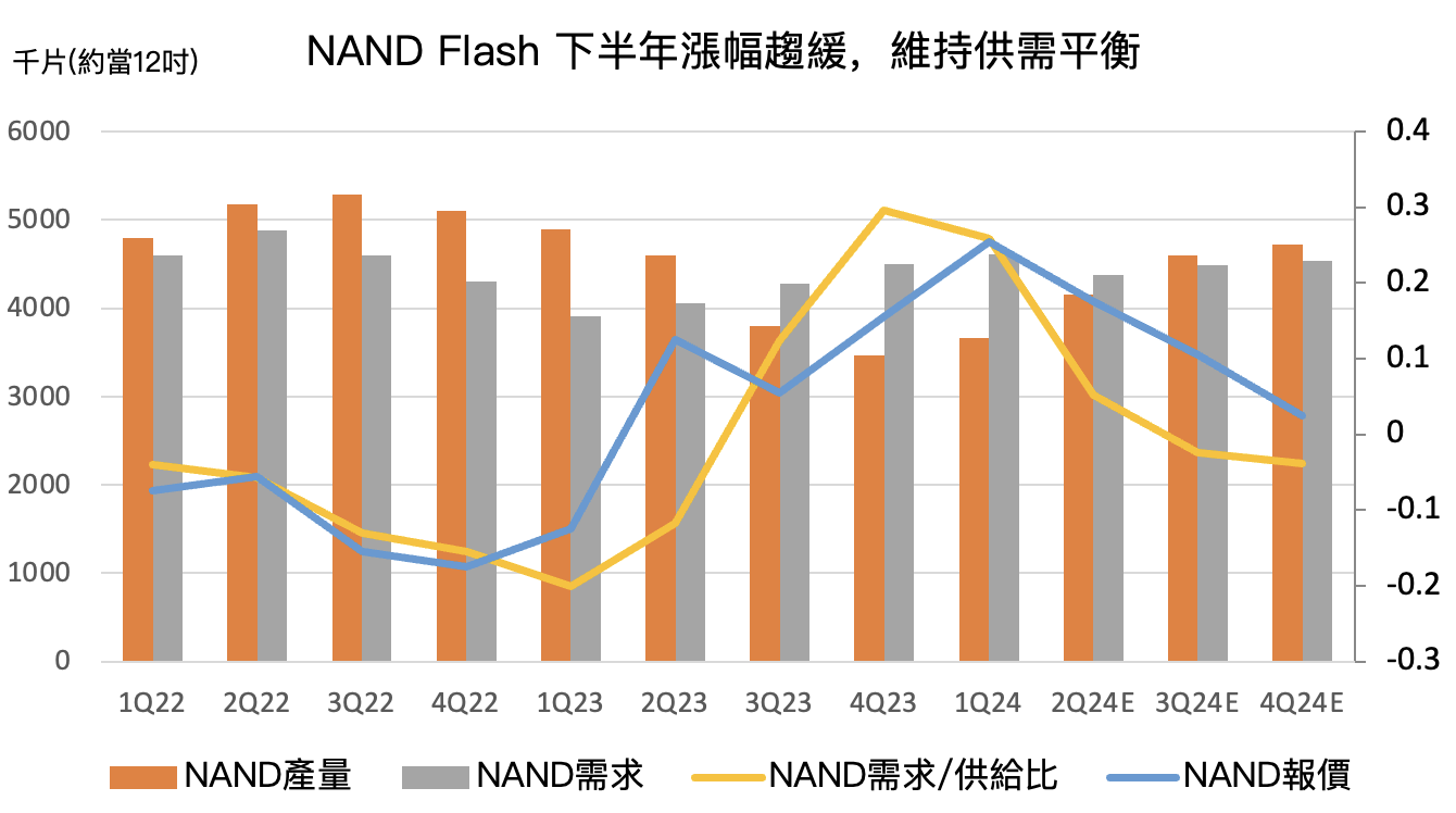 展望 2024 下半年,預估 DRAM 位元需求 YoY+14~16%、長期 CAGR+14~16%;NAND Flash YoY+14~16%、長期 CAGR 從 +21~23% 下修到 +17~19%。