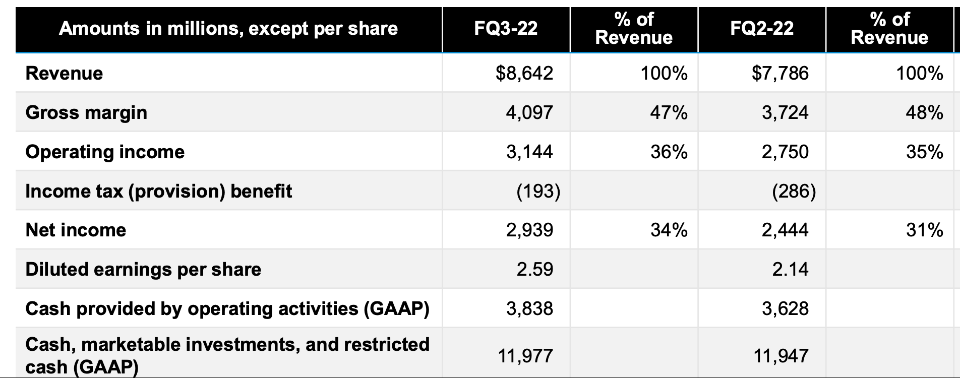 1. 美光 FY2022Q3 營收為 86.4 億美元(以下同),QoQ+11%、YoY+16%,主要由資料中心成長帶動;毛利率為 47.4%,QoQ-0.6ppts;營業利益率為 36.0%,QoQ-1.0ppts,稅後淨利為 29 億,QoQ+20%、稀釋後 EPS 為 2.59 元,QoQ+0.45 元,優於財測高標的 2.56 元。