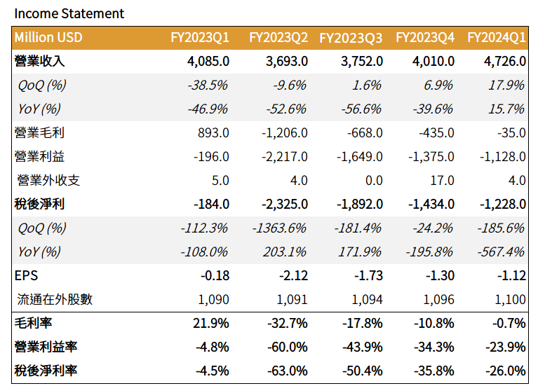 美光 FY2024Q1 營收 47.3 億美元(以下同),QoQ+17.9%、YoY+15.7%,高於市場共識 45.4 億元;毛利率 -0.7%,QoQ+10.1ppts、YoY-22.6ppts,主要受惠 DRAM 價格在本季明顯上漲;EPS -1.12 元,QoQ+0.18 元、YoY-0.94 元,整體營運優於財測,虧損幅度較上季大幅減少。