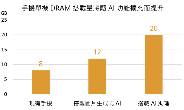 手機、PC 需求重回成長,未來隨加入 AI 功能,單機 DRAM 搭載量將有 50~100% 的成長