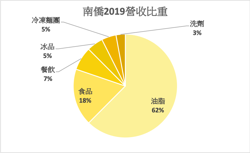 2019 年最主要營收來源為油脂類,占整體營收 62%,故南僑未來營運表現主要須關注油脂事業之發展。