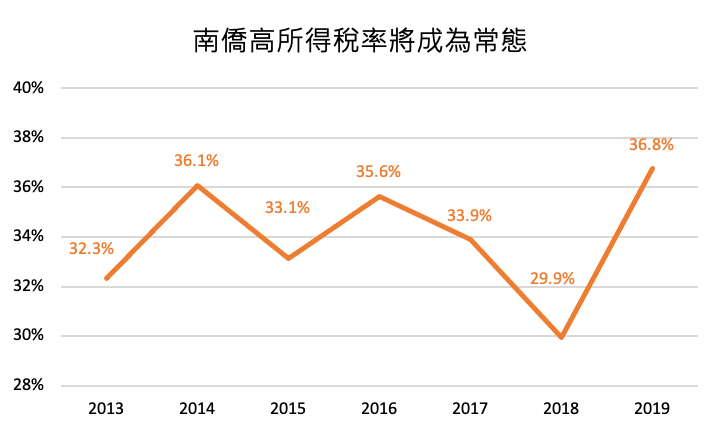 對南僑中國業務的不利因素之一為高稅率:南僑 2018 - 2020 年的所得稅率約在 36% - 40%,相較於台灣其他同業都高。上述現象背後主要原因有二,一是因為在大陸銷售產品所支付的增值稅與進項成本的稅差,二是由於營業占比最重的大陸事業所得除了需要向中國政府繳納所得稅,獲利合併進台灣報表後仍須繳納海外不可扣抵之營利事業所得稅,造成雙重課稅。上述兩個問題短期無法可解,高稅率將成為南僑的常態,加上天津廠高新企業稅賦優惠(稅率由 25% 減免為 15%)於 2019 年到期,目前新方案仍在申請中,使得 2020 年暫估所得稅率攀升至近 40%,加重整體稅賦負擔。