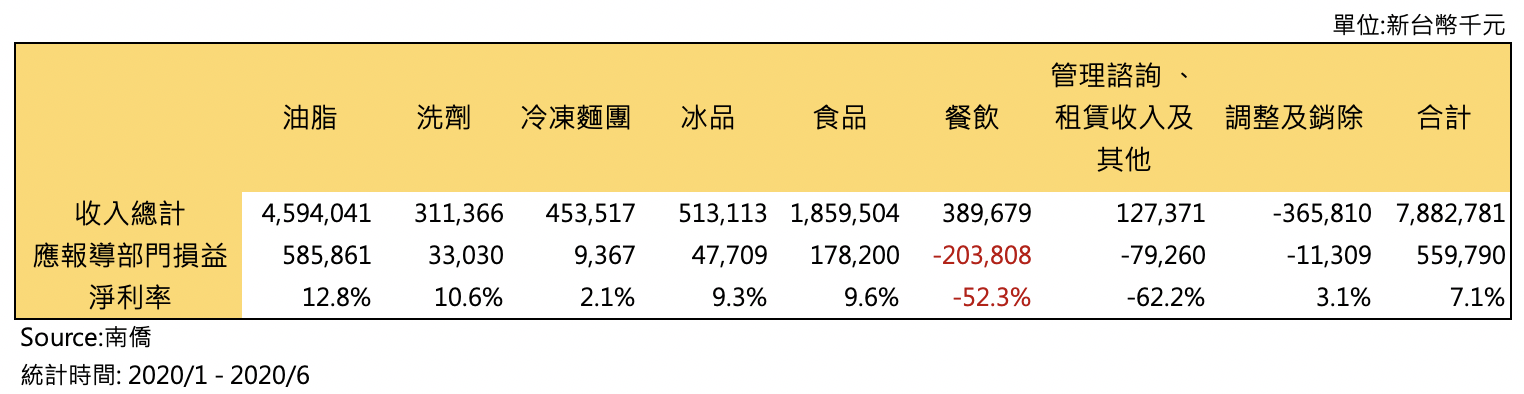 在受到疫情封城影響,餐飲部門在 2020 年成為大幅拖累整間公司獲利的主要原因,該部門上半年營收衰退43%,虧損約 2 億元。過去餐飲部門的虧損一般都在幾千萬的範圍內,並不會超過億元,因此南僑是所謂的疫情受難公司,然以投資機會而言,待疫情影響過後,相關數字可望大幅改善,獲利回升可期。