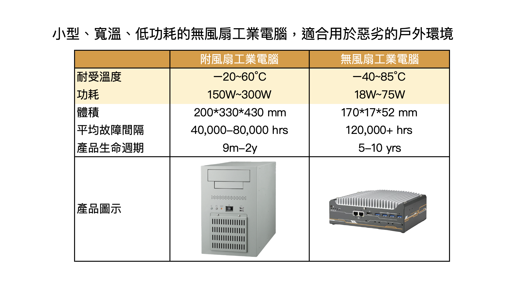 此外,相較於傳統的工業電腦,無風扇工業電腦具備更極端的溫度耐受能力,隨越來越多的 AI 裝置需要走出機房在惡劣的戶外環境執行運算,就會需要用到寬溫、防水、穩定可靠性高的無風扇工業電腦,小型體積、低功耗的特性也更適用於邊緣端的應用場景。此外,隨國際的淨零碳排趨勢,判斷未來較節能與低碳排的無風扇工業電腦將成為主流。