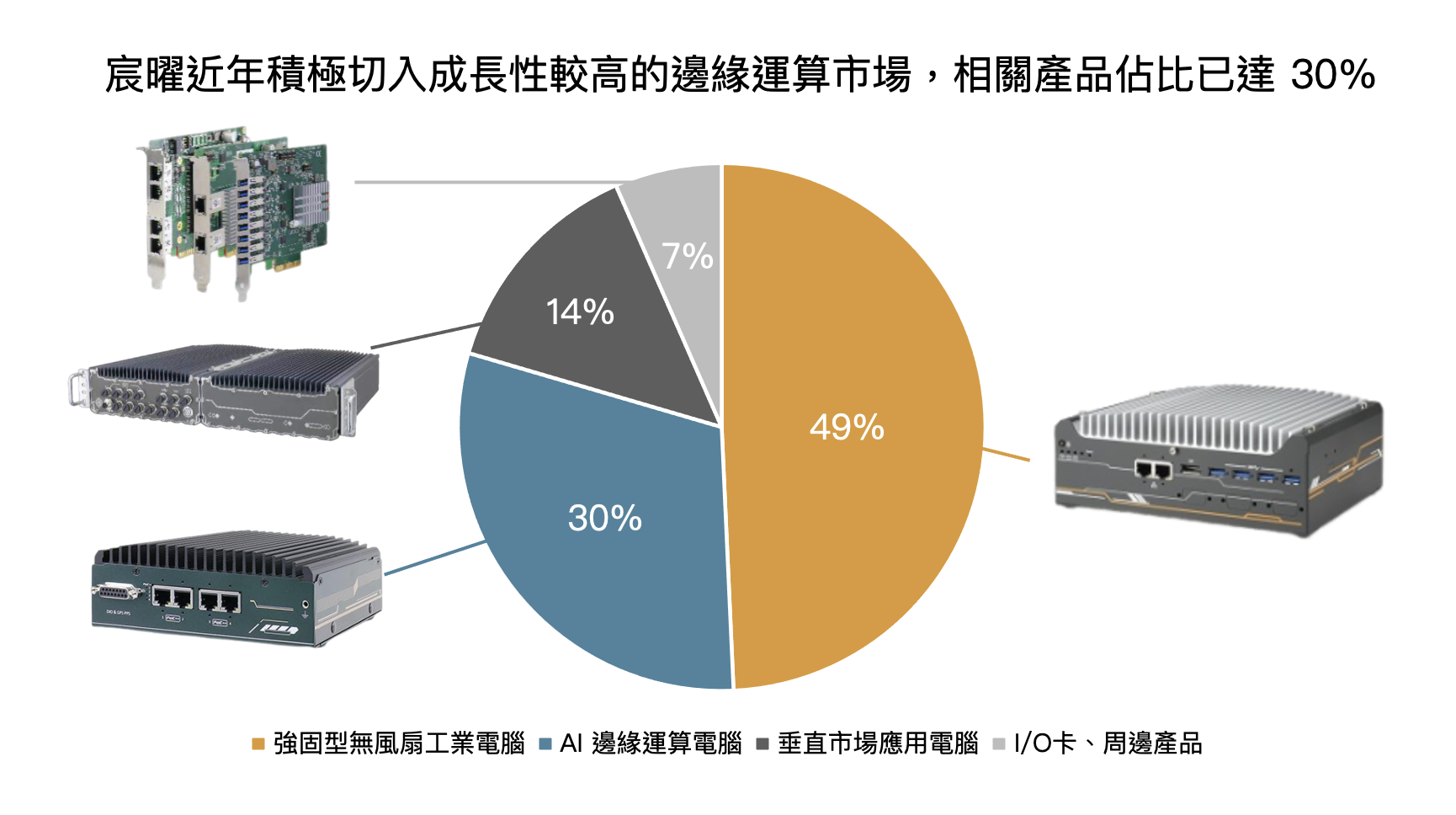 宸曜近年積極切入成長性較高的 AI 邊緣運算市場,相關產品佔比已達 30%,且其中自駕車載電腦算力已達 Level 3、Level 4 等級。以下將分別介紹 AI 邊緣運算與車載電腦這兩大主要的成長動能。