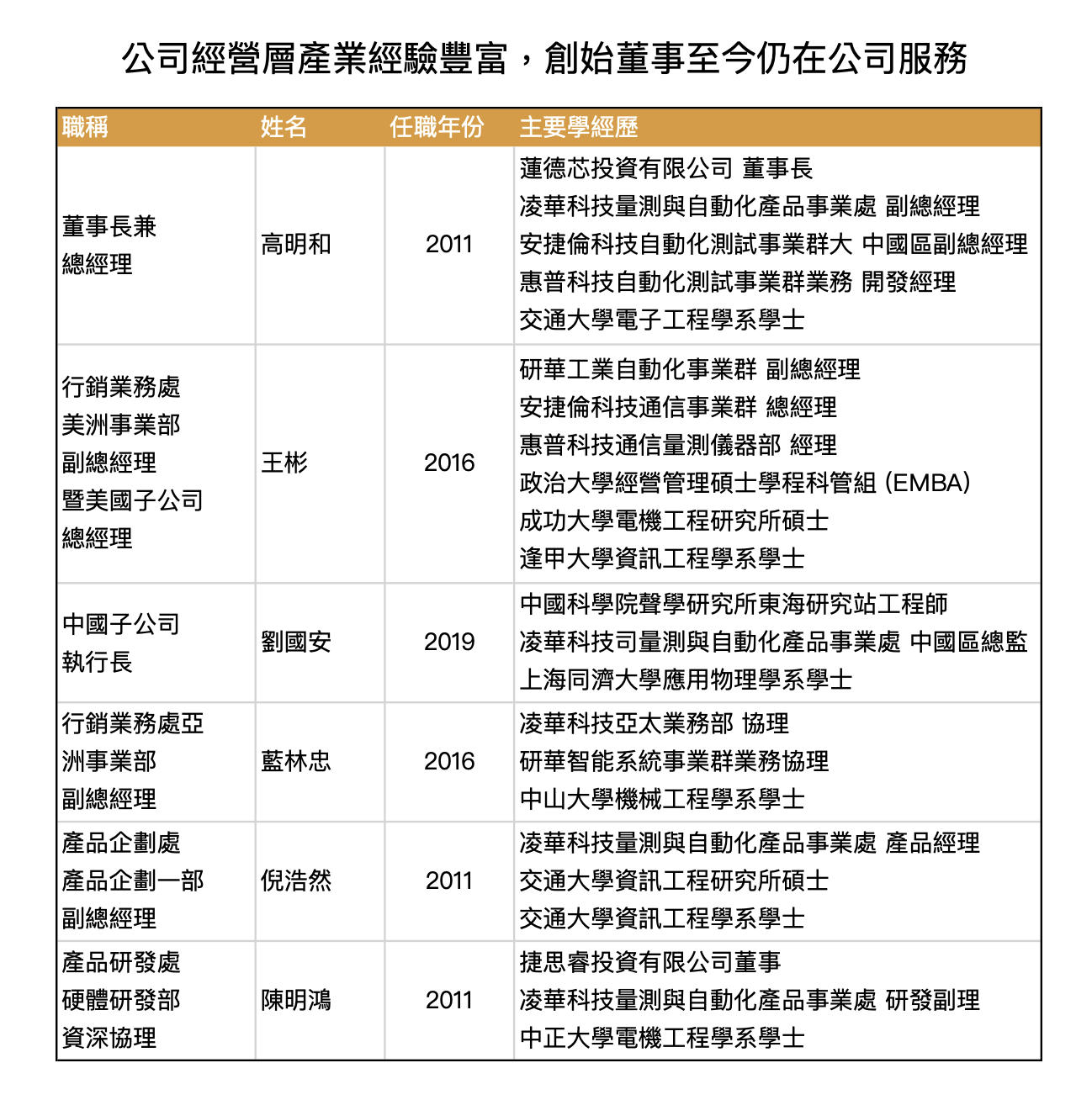 公司經營層具豐富的產業經驗,曾任於國內外多家工業電腦大廠,包括研華(市:2395) 、凌華(市:6166) 、安捷倫科技(NYSE: A)、惠普科技(HPQ)等,以過往營運績效來看,對管理層的經營能力可正面看待。