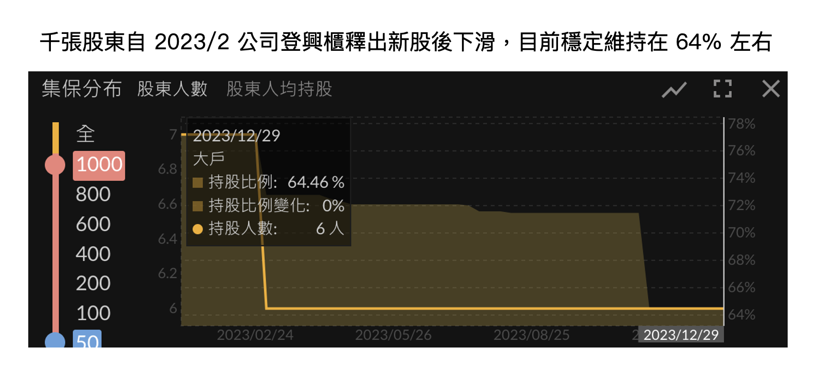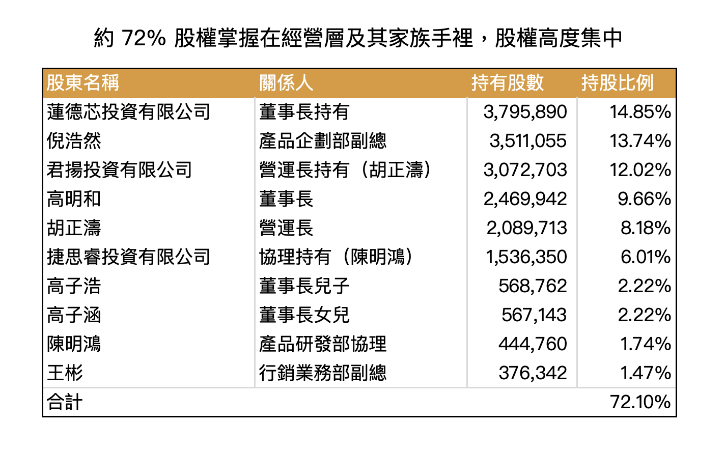 股權方面,前十大股東皆為公司派成員,董事長家族直間接持有 29% 左右股權,其餘則掌握在公司其他經營層手裡。前十大股東合計持有比例達 72%,整體集中穩定。