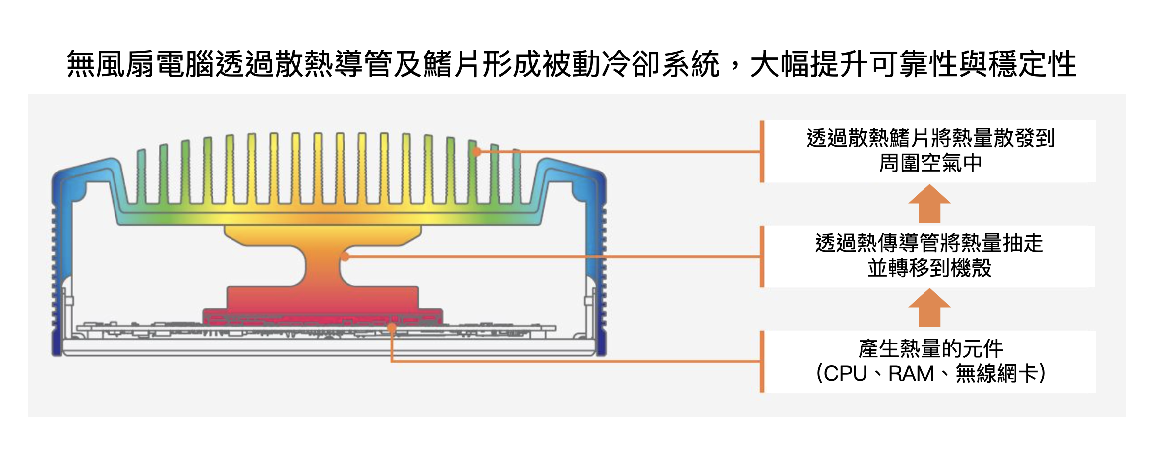 無風扇工業電腦透過被動冷卻系統散熱解決了此痛點,改將發熱元件貼在金屬上,並利用熱傳導管與散熱鰭片將熱排出,使其更耐用且不易故障,可在惡劣環境下運行並提供更可靠、穩定的運算能力。