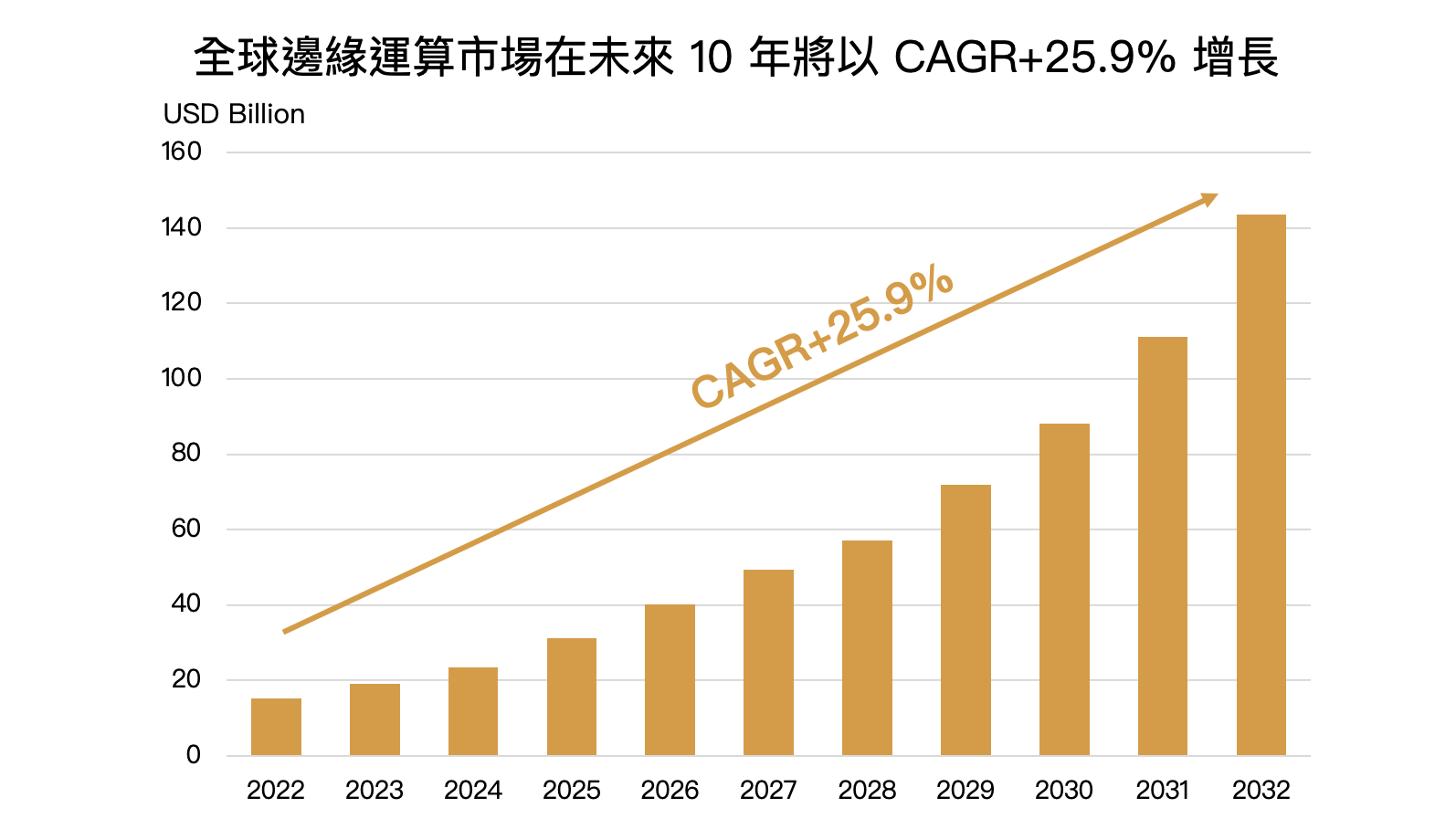 根據 market.us 研調,全球 AI 邊緣運算市場在 2023~2032 年將以 25.9% 的 CAGR 持續成長(其中以工業製造、汽車與政府基建的佔比最大),可將 AI 演算法和模型直接佈局於本地的硬體上(物聯網設備、攝影機、感測器等),並即時做出決策,無需將資料傳輸到遠端伺服器進行分析,以此減少延遲與網路頻寬壓力,同時也可維持資料的機密性。
