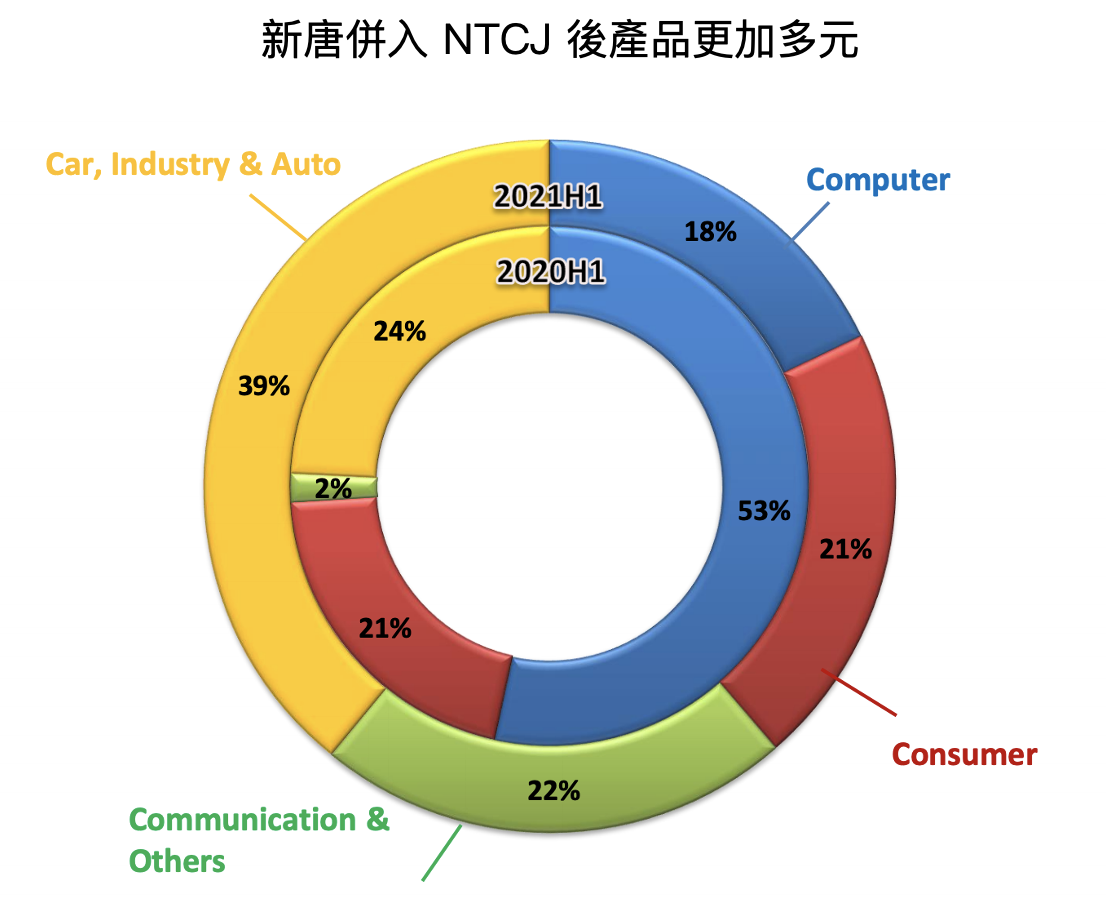 新唐過往有 50% 以上營收都集中在電腦,但在併入日本 Panasonic 半導體部門後,公司在通訊、車用及自動化工控佔比明顯提升,也使產品組合更加多元。