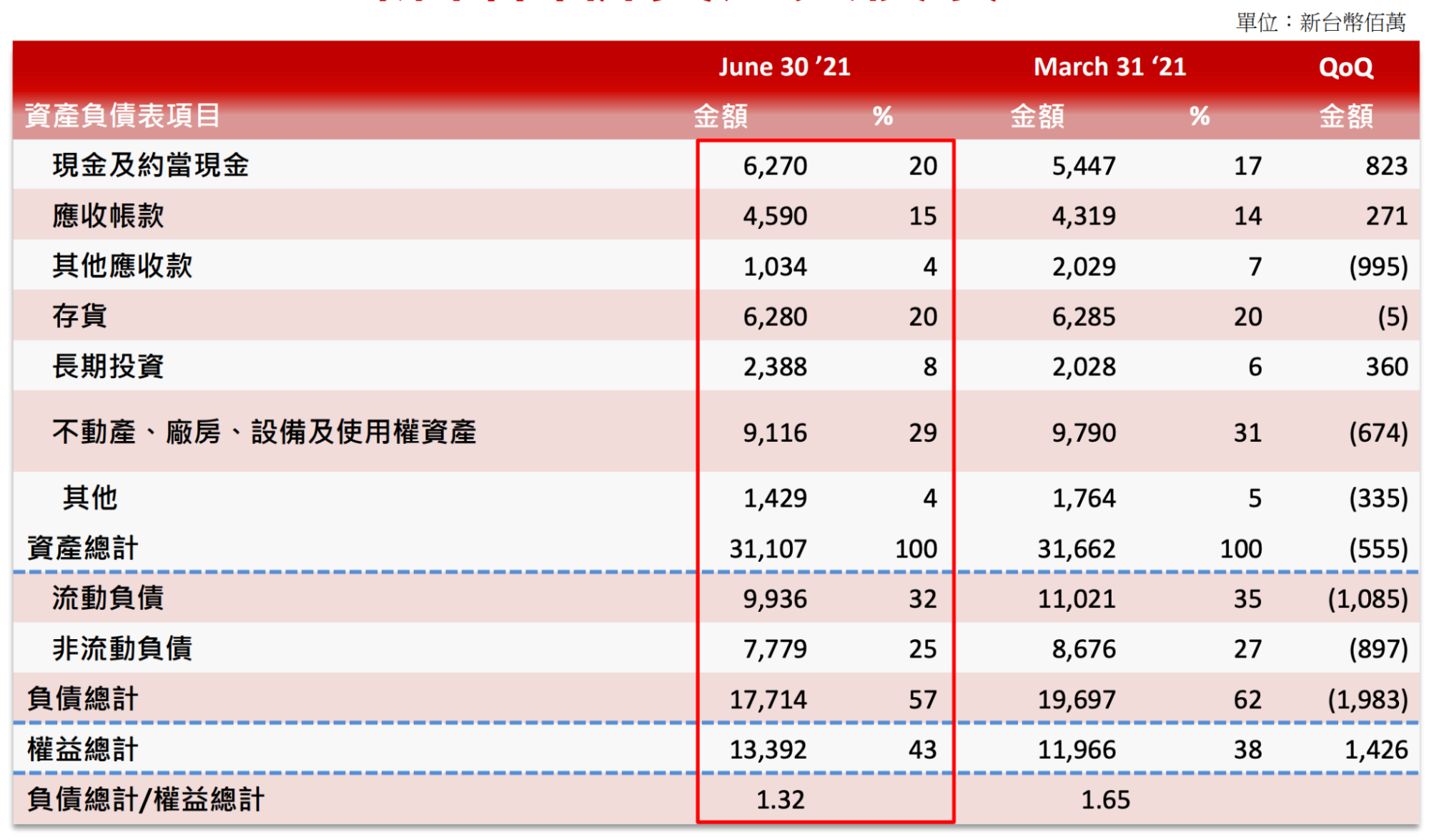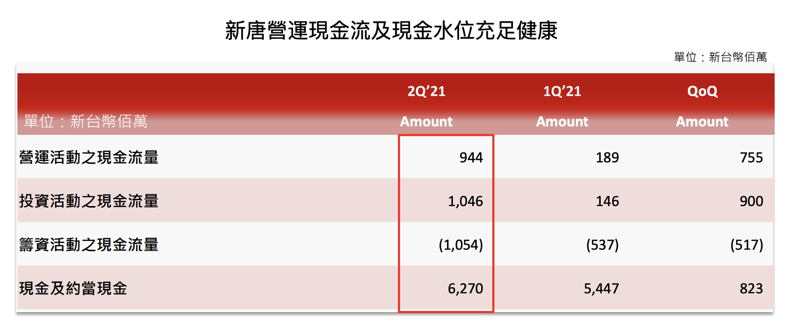 3. 新唐 2021Q2 營運現金流為 9.4 億元,較 Q1 的 1.9 億元明顯增加,而目前帳上現金約 62.7 億元,整體現金流狀況健康。