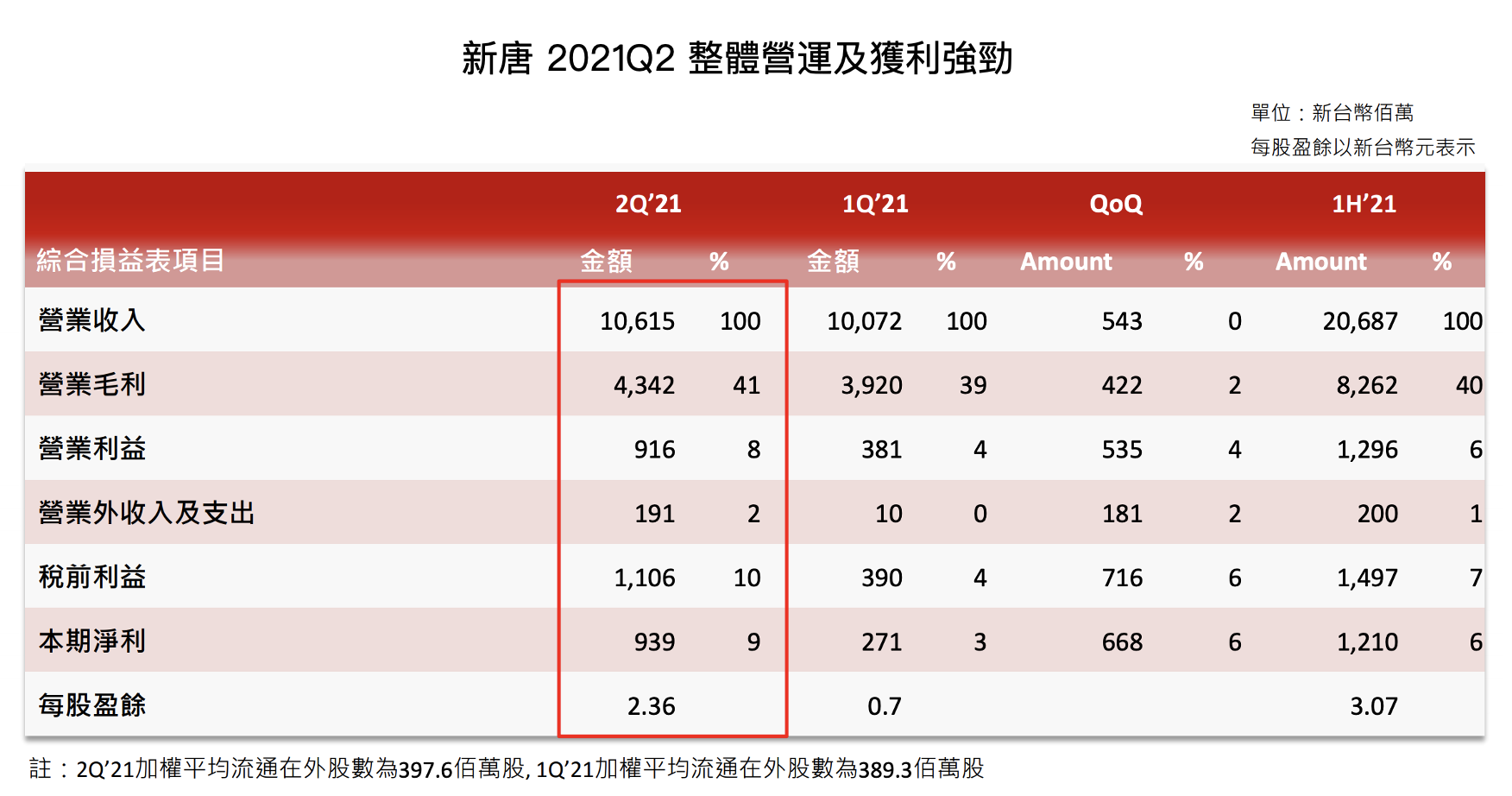 1. 新唐 2021Q2 營收為 106.2 億元新台幣(以下同),YoY+246.8%,QoQ+5.4%;毛利率41%,YoY+1.4% ppts,QoQ+2.1% ppts,毛利率上升原因主要為公司產品漲價帶動 ASP (平均售價)提升,以及產品組合轉佳;稅後淨利為 9.4 億元,YoY+284.8%,QoQ+348.1%,EPS 為 2.36 元,YoY+1.2 元,QoQ+1.66 元。公司稅後淨利明顯較 Q1 成長主要因本業營運成長、轉投資公司的股利收入認列及 Panasonic 收購協商金的一次性認列。