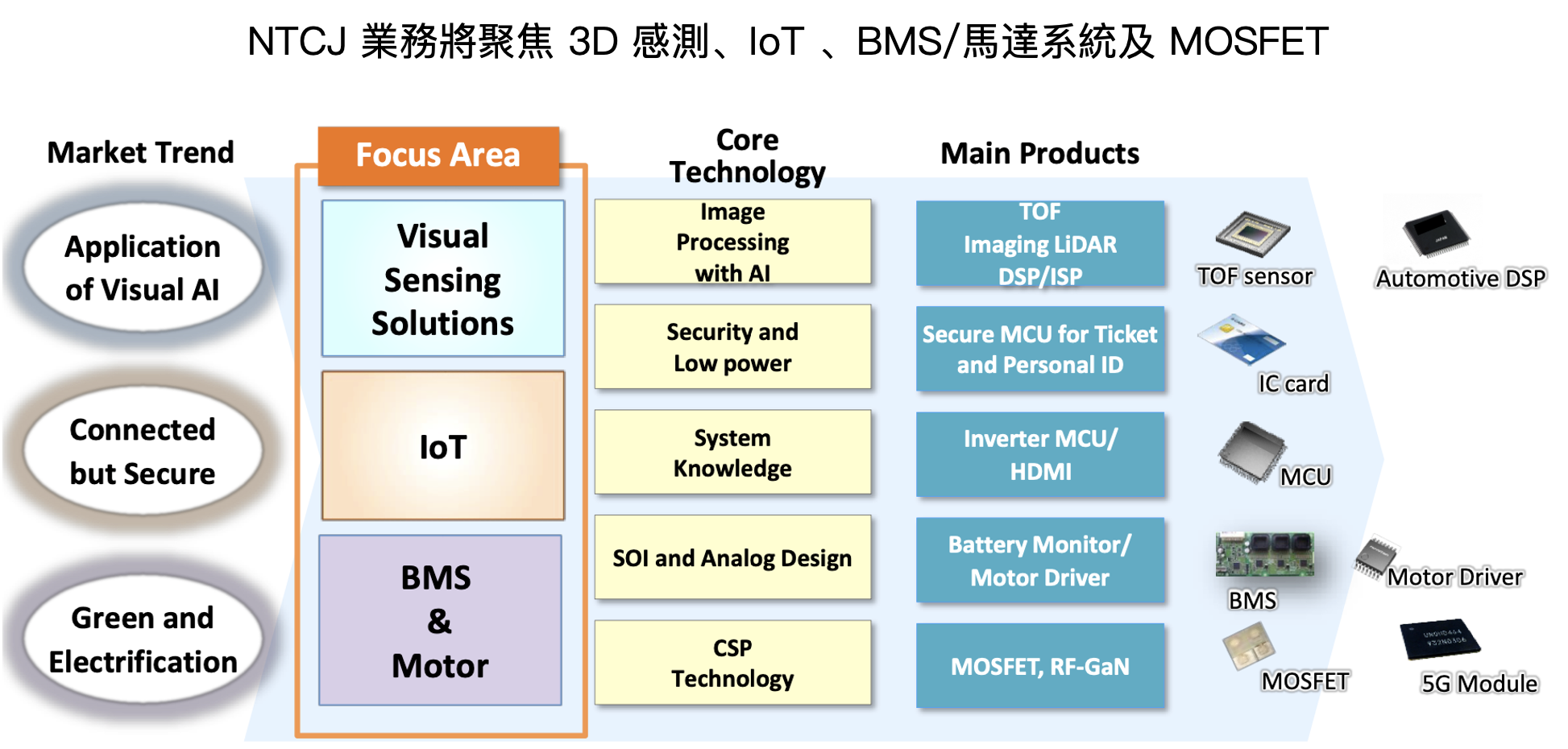 新唐在入主後將 NTCJ 重新劃分為感測、 IoT、BMS/Motor(Battery Management System:電池管理系統)、MOSFET(半導體場效電晶體) 四大業務,讓領導人自由表現,並要求盈虧自負,期許藉由良性競爭的方式激勵各部門發展。