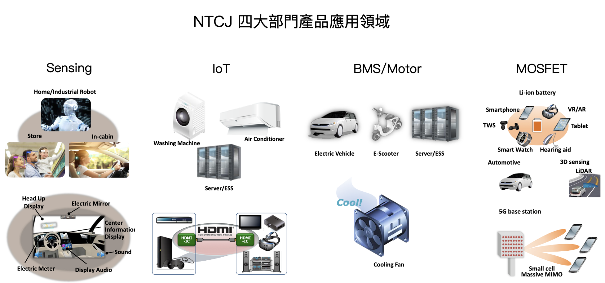 MOSFET 部分,透過 NTCJ 獨有的 CSP 技術縮小產品尺寸,將可應用在包含智慧型手機的電池及快充裝置保護,公司目前已打入中國市場多款高階 5G 手機。