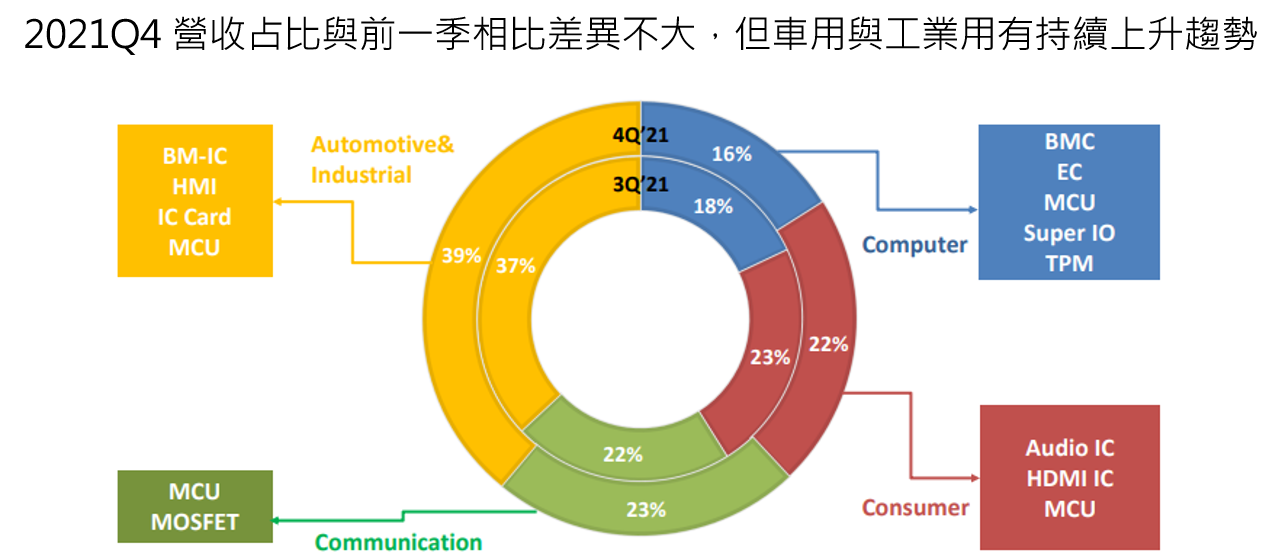 1. 新唐 2021Q4 營收占比為 Automotive & Industrial(車用與工業用)39%、Communication(通訊)23%、Consumer(消費性)22%、Computer(電腦)16%。整體與 2021Q3 差異不大,但車用與工業用部門持續緩步上升。研究團隊認為未來車用與工業用會是新唐最具成長動能的業務,占比有望持續提升。
