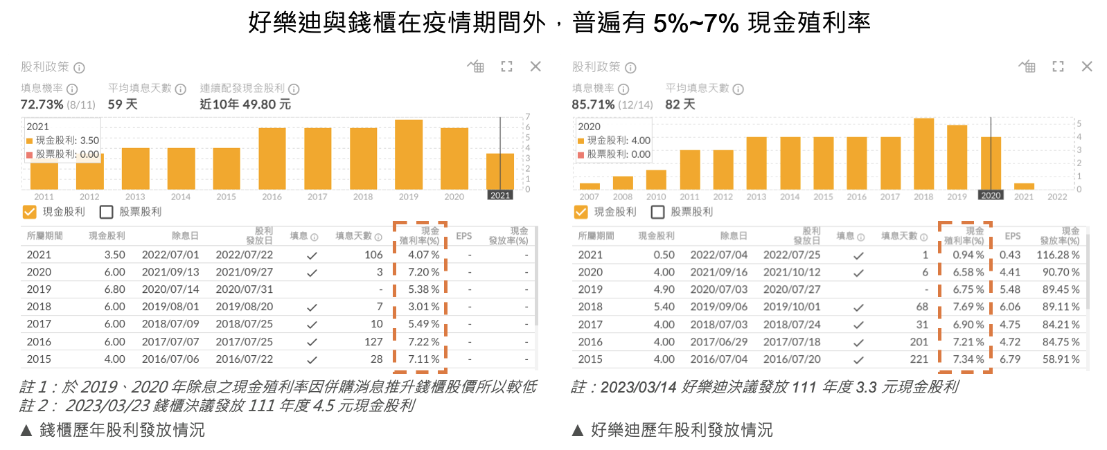 - 展望 2023 年,錢櫃將受惠於疫後消費復甦,另因其多年約 5~7% 之高現金殖利率以及目前 Forward P/E 11 倍處於歷史本益比下緣,下檔風險有限。