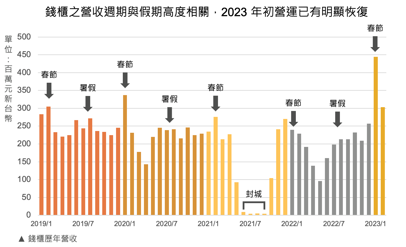 近年因疫情影響,錢櫃營收顯著衰退,然隨 2022 年底台灣防疫政策鬆綁,實體消費逐漸回溫, KTV 業者將直接受惠。檢視錢櫃 2023 年 1、2 月累積營收共 7.47 億元,高於 2019、2020 年同期之 5.85 億、5.68 億,創近五年新高。