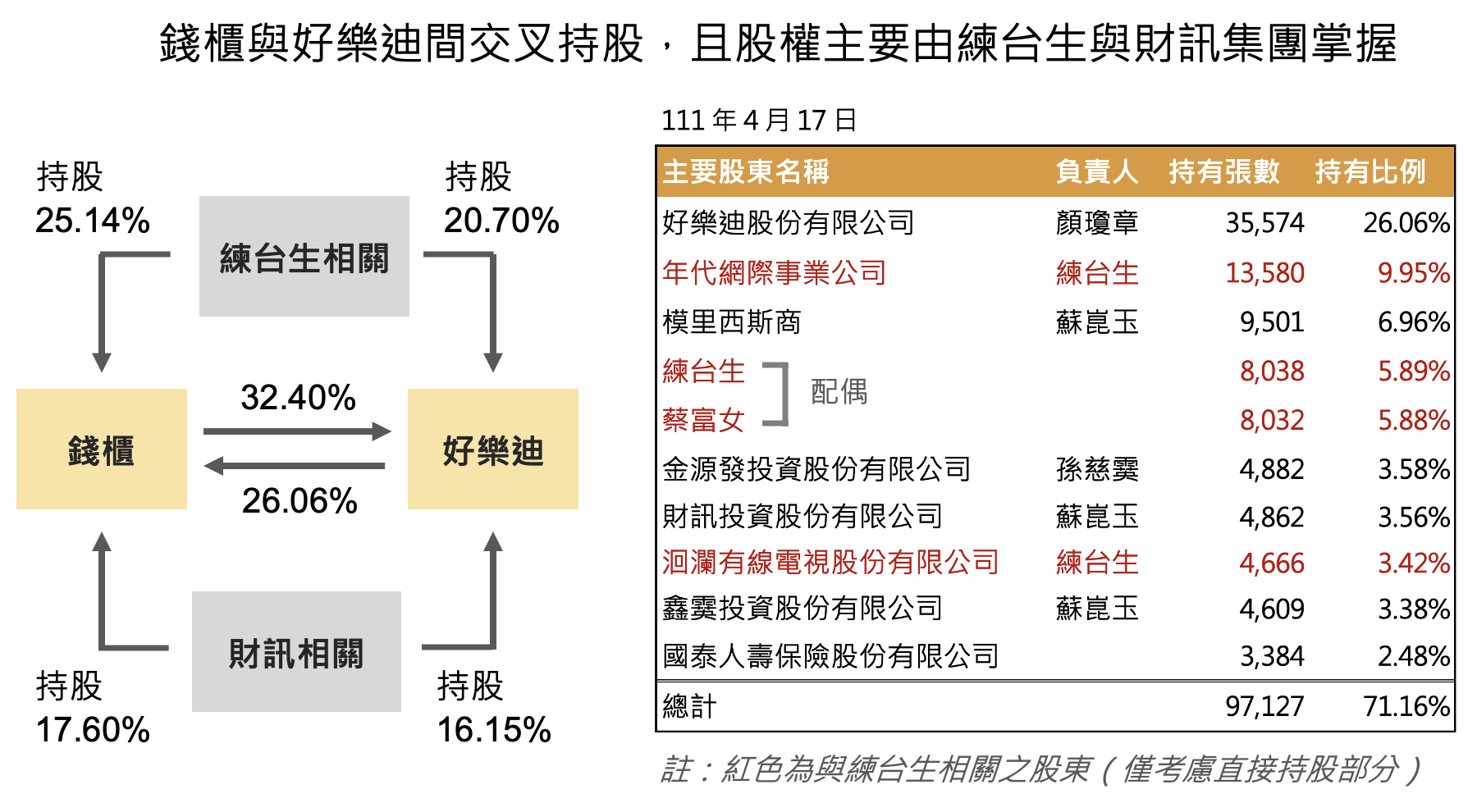 錢櫃前十大股東中,好樂迪為主要股東,佔比 26.06%,錢櫃同時也持有好樂迪 32.40%。除了互相交叉持股外,佔比最高的便為與練台生相關之股東,其次則為台灣財經雜誌公司財訊所持有,而好樂迪前十大股東組成也與錢櫃相似。