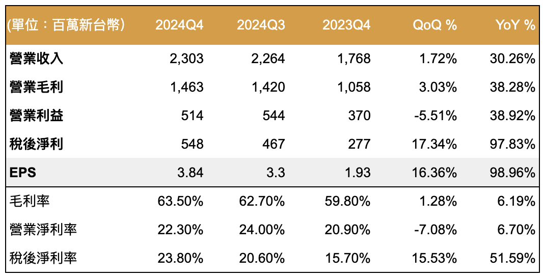 - 稅後淨利:24Q4 稅後淨利 5.48 億元,季增 17.34%,年增 97.83%。