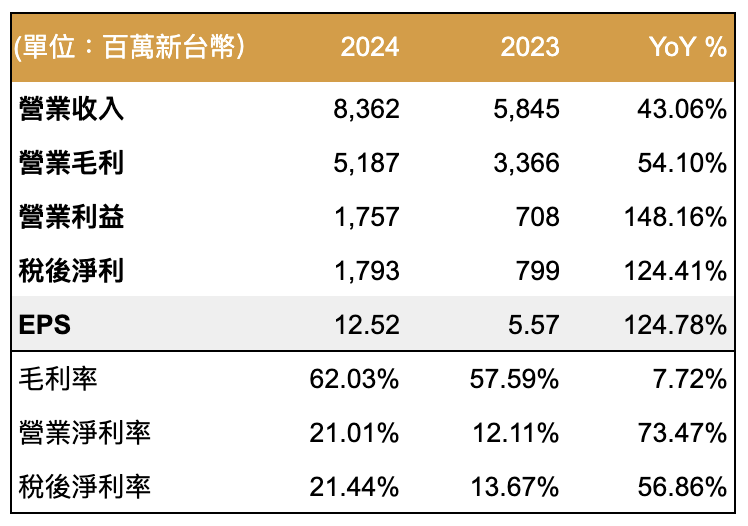 - 營收:2024 年合併營收 83.62 億元,年增 43.06%。