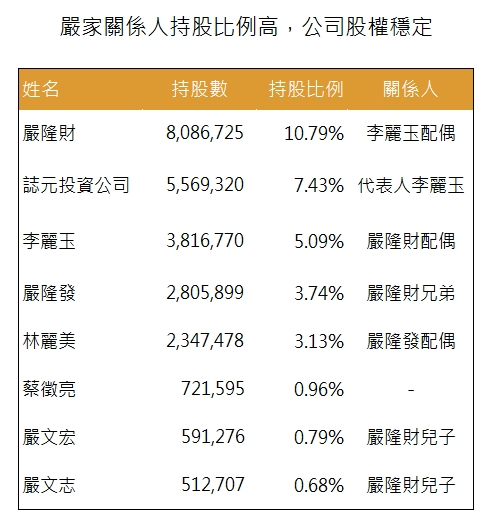 公司前幾大股東多數為嚴家關係人,股權結構穩定