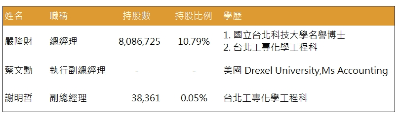 董事長嚴隆財先生畢業於台北工專(現台北科技大學)化工系,利用所學化工專業知識和過往在南亞塑膠(市:1303)的工作經驗帶領公司。而兩位副總經理則分別憑藉專業會計經驗、化學背景幫助公司營運。