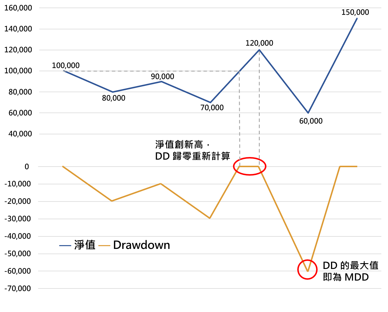 策略虧損拉回(Drawdown,DD)指的是資金淨值從高峰值滑落的幅度,因此每當資金淨值創新高時,DD 都會重新計算。而 MDD 指的就是 DD 中的最大值,顯示了使用此策略需要預期的最大資金回檔幅度(甚至可以將它想像成資金一投入就可能產生的虧損幅度),因此 MDD 較大的策略較不適合對回檔耐受度低的投資人使用,且我們投入執行該策略的資金也應大於 MDD,否則可能在虧損尚未結束前,策略就因資金不足而被迫停止。