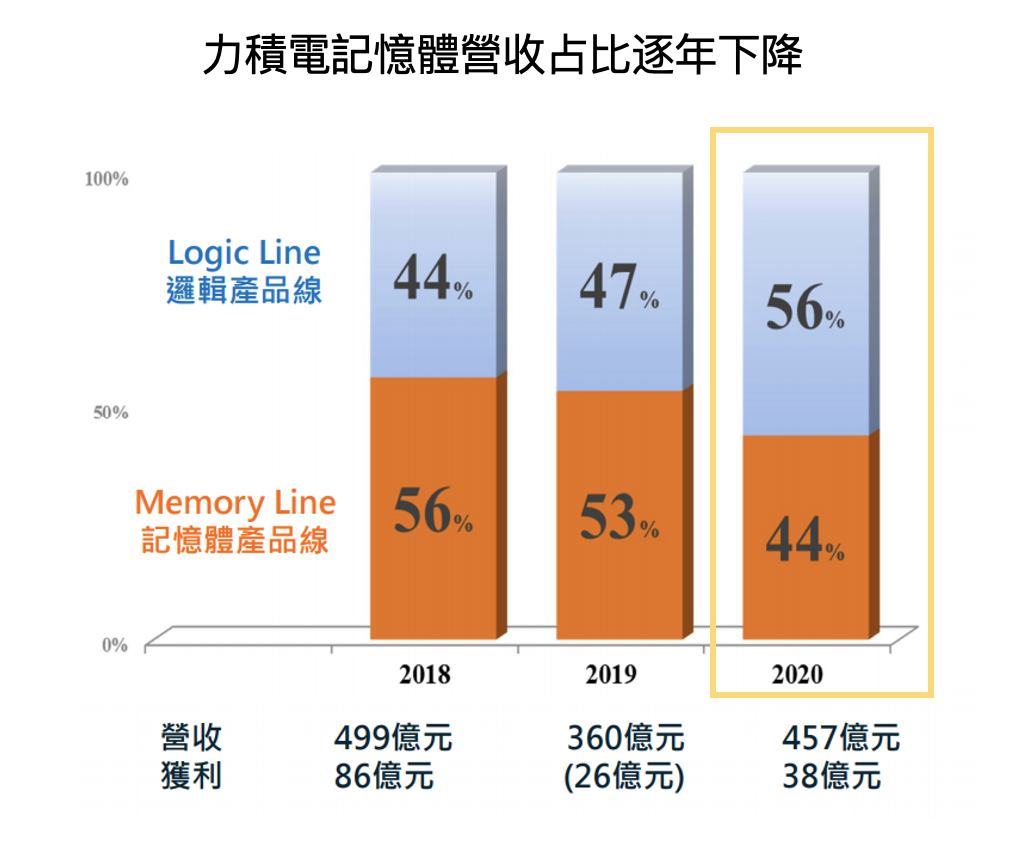 1. 力積電 2021Q1 營收佔比為邏輯 IC 55~60%(其中 LCD 驅動 IC 佔比 40%、CMOS(影像感測元件) 20%、PMIC(電源管理 IC)20%)、記憶體 40~45%(其中 DRAM 90%、Nor/NAND Flash 10%),由於記憶體為景氣循環產業,營運較不穩定,因此公司近幾年持續降低記憶體業務佔比,期望減少營運波動。