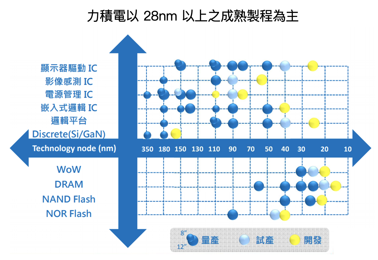 2. 力積電目前全產線產能利用率接近 100%。其中 12 吋產能為 10.4 萬片/月,邏輯 IC 佔 55%、DRAM 佔 45%,預計到 2021 年底 12 吋產能將增加至 11 萬片/月,製程以 28~180nm 為主;而 8 吋產能為 11.5 萬片/月,其中離散元件佔比 75%、其餘邏輯 IC 佔 25%,製程以 110~180nm 為主。預計公司 2021 年整體產能將不會有明顯增加。