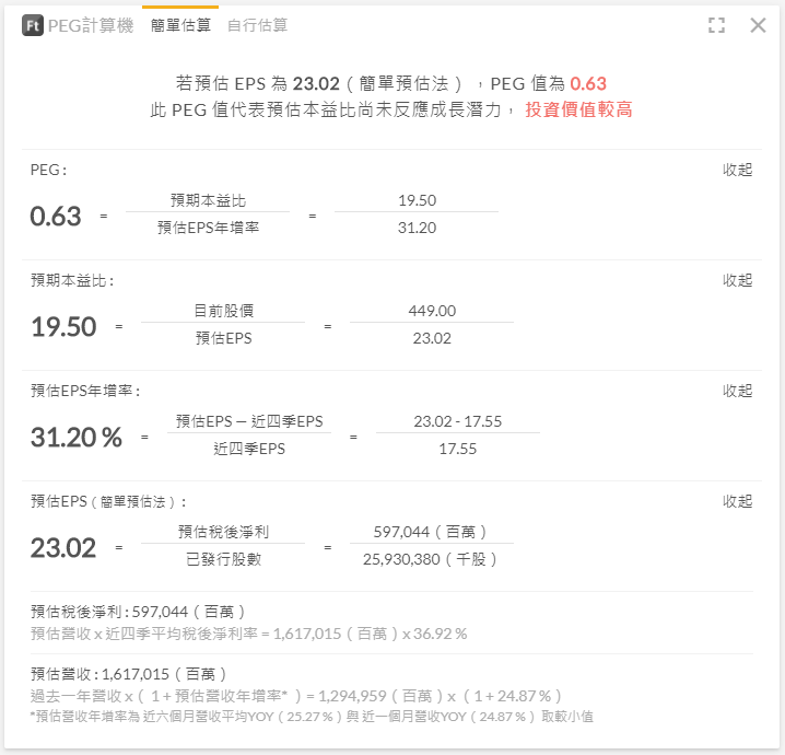 - 下圖是台積電 2330 的 PEG 計算器結果(並不是我們沒有叫大家買進哦)。簡單估算的版本是富果FUGLE的程式以粗估方式自動代入計算的結果,而若你認為這個預估 EPS 不是你要的,可以到自行估算的版本,自行輸入計算器中!