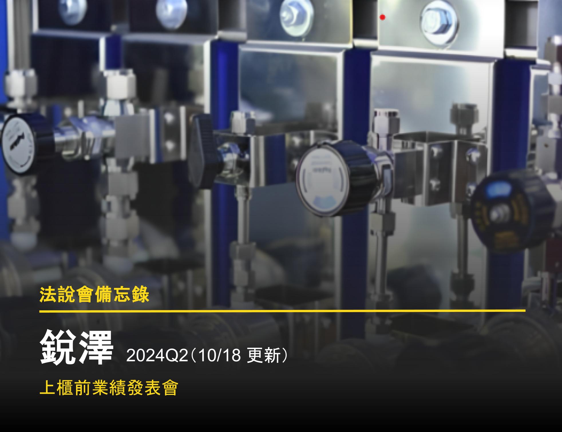 銳澤(興櫃:7703)成立於 2007 年,為台灣廠務管道工程商,聖暉朋億集團的一員(朋億持股銳澤 45.89%),目前員工人數約 212 人。公司是從二次配(二次配)氣體管路工程起家,一路擴大至目前也有辦法進行主系統工程、氣體供應系統整合工程及氣體供應系統設備製造。2024H1 營收佔比為主系統工程 38%、二次配工程 45%、小型維護工程 14%、廠務設備及材料銷售 3%。