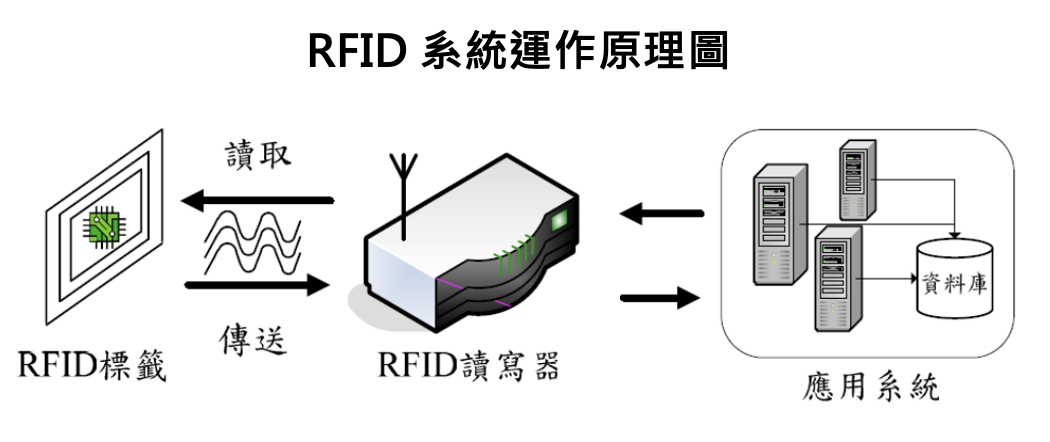 RFID(Radio Frequency Identification)是一種無線通訊技術,原理為透過無線電波來識別和追蹤物體。RFID 系統由 RFID 電子標籤(Tag/Label)和 RFID 讀取器(Reader)組成,並在讀取器與電子標籤近距離感應後,採用後台應用系統快速辨認 ID。