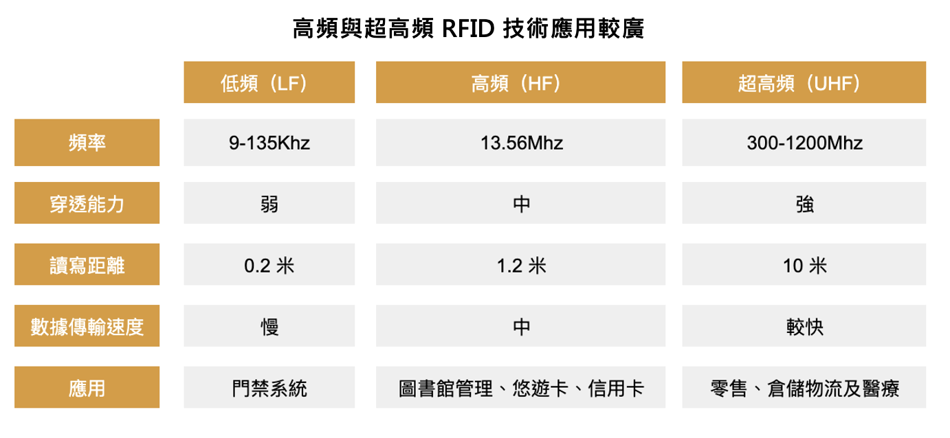 被動式 RFID 電子標籤依照頻率高低,可分為低頻、高頻、超高頻,頻率越高讀寫的距離越遠、傳輸速度也越快。