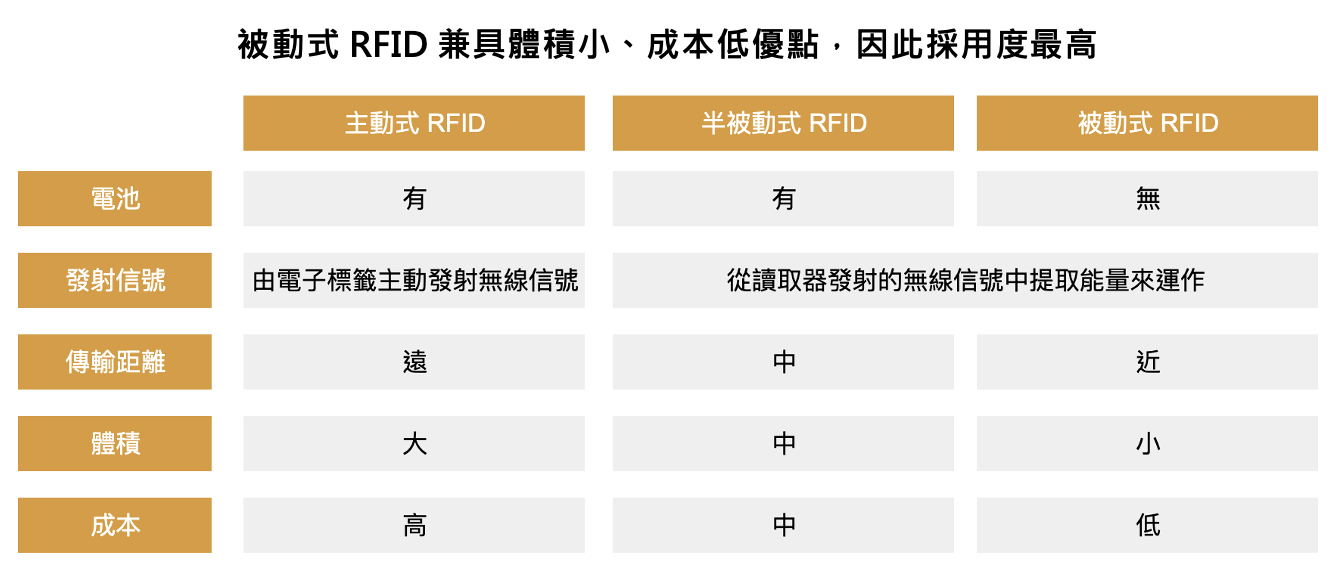RFID 電子標籤依照有無電池可分為主動式、半被動式與被動式,其中主動式 RFID 電子標籤內含電池,可主動發射無線信號,通常用於追蹤物流運輸、醫療產業的高價值資產;被動式 RFID 電子標籤不含電池,電力來源是由讀取器發出電波,當標籤讀取來自讀取器傳來的電波後,轉化為自身電力來回傳信號,具備體積小、成本較低優勢,目前市場最主要採用被動式 RFID 電子標籤;而半被動式內含電池,但電池僅供電子標籤電路使用,主要應用於工業。
