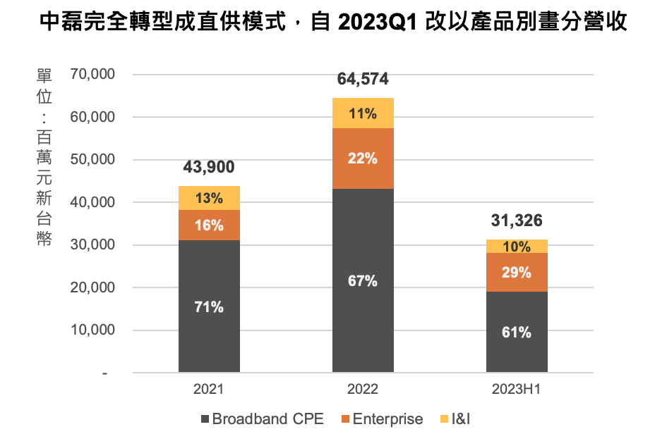 公司順利轉型至直供模式。2023Q2 因客戶庫存調整產品降低 Broadband CPE 營收占比,長期將維持 67%