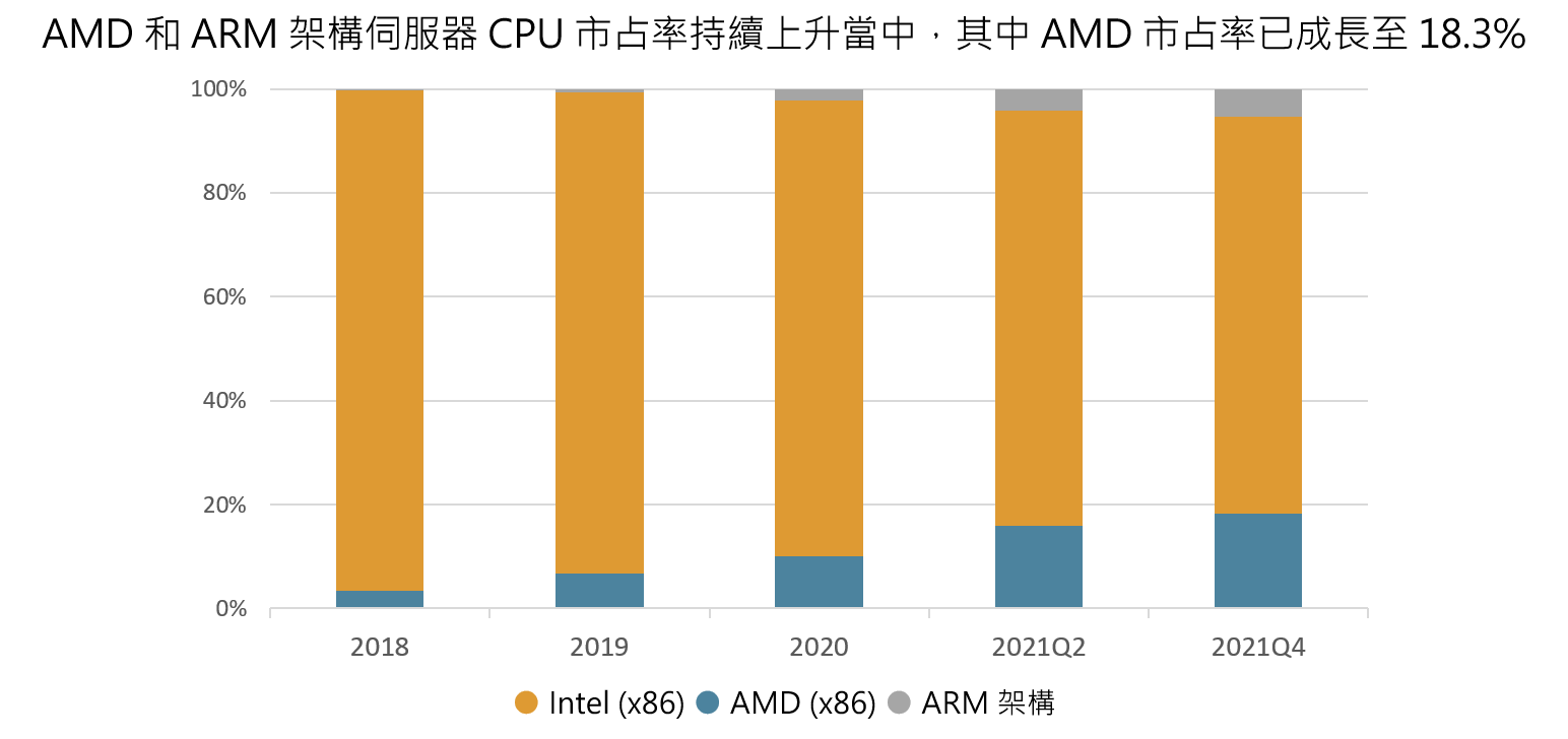 Intel 的 Xeon 系列伺服器 CPU 曾一度佔據高達 99% 的市占率,但根據調研機構 Omdia 2021Q2 的資料顯示,AMD 的市占率自 2018 年的 3.3% 已成長至 18.3%,正持續侵蝕 Intel 的市場份額(目前為 76%)。