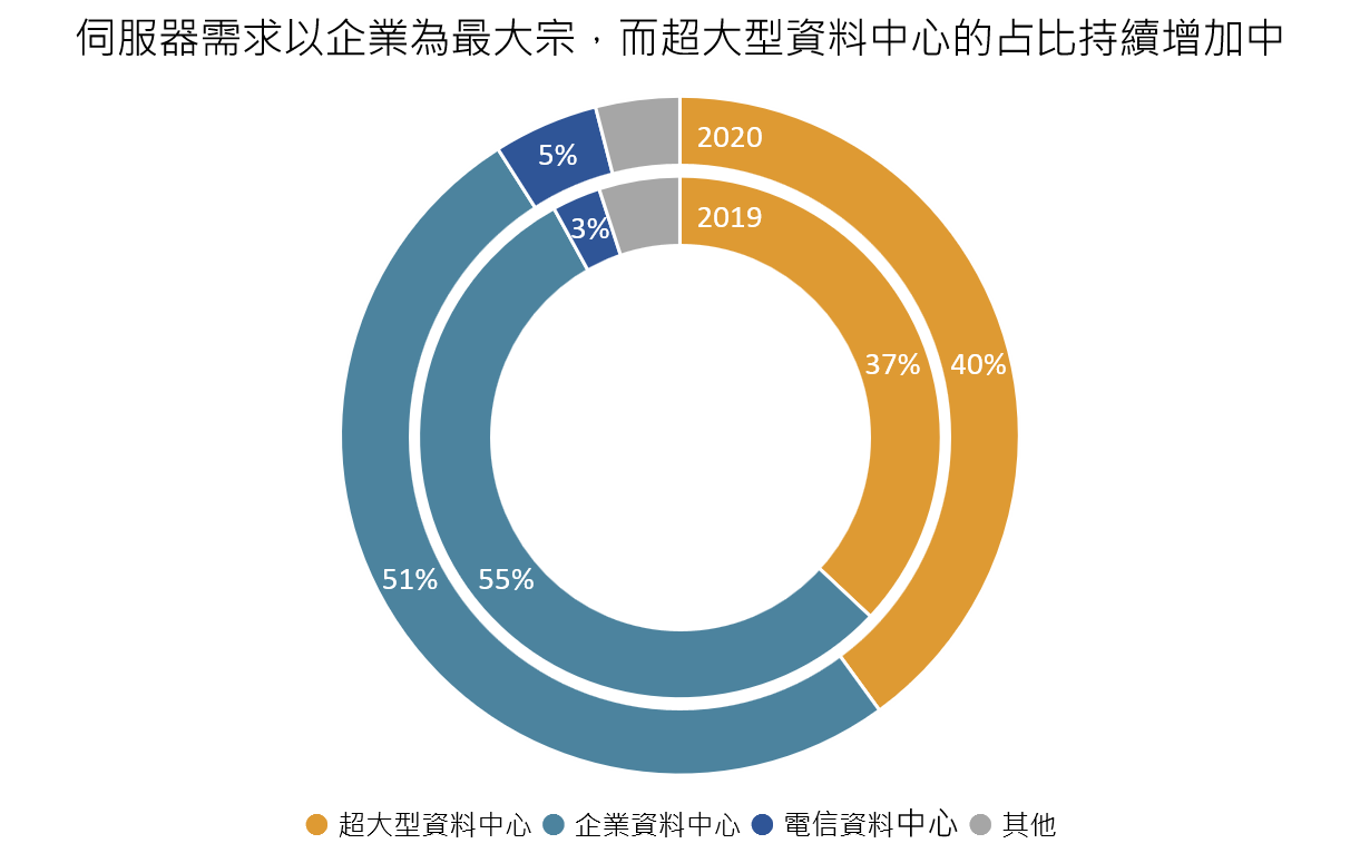 下游伺服器需求以企業資料中心為最大宗,然而超大型資料中心占比持續增加中